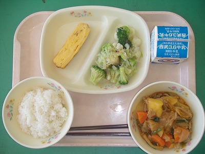9月14日(木)の給食☆本日の献立☆ ご飯、じゃが豚キムチ、厚焼きたまご、花野菜のサラダ じゃが豚キムチのピリ辛味が、食欲をそそり、パワーもつきそうでした。 |