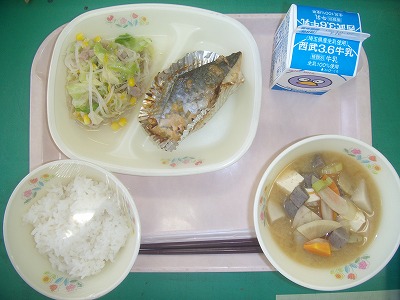 9月27日(木)の給食☆本日の献立☆ ご飯、サワラのねぎマヨポン焼き、野菜炒め、みそけんちん汁 ねぎマヨポン焼きとは?何かと考えて食べてみましたら、ねぎとマヨネーズとポン酢でした。それぞれが良く溶け合っておいしかったです。けんちん汁も味噌味は珍しいです。体が温まりました。 |