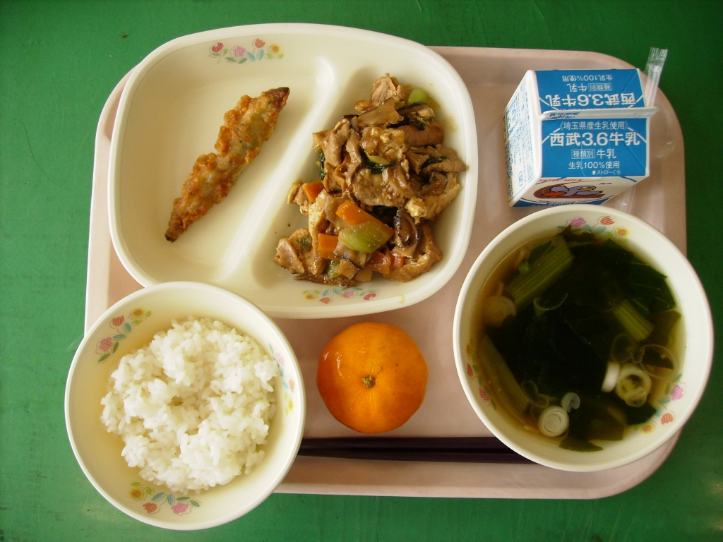 牛乳、ごはん、わかめスープ ししゃもフリッター、家常豆腐(ジャーツァンドーフ) 冷凍みかん