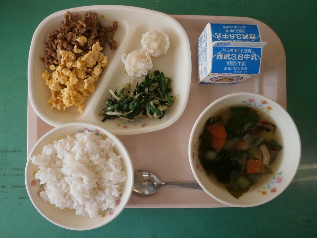 ☆今日の献立☆ 牛乳、ビビンバ(ごはん、肉、卵、ナムル) えびシュウマイ、中華スープ
