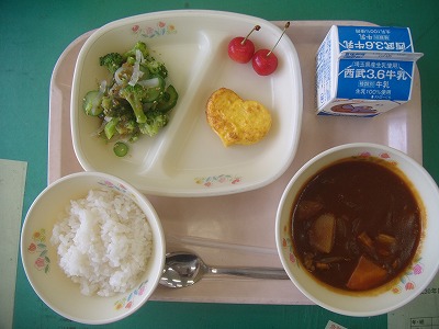 6月22日(金)の給食☆本日の献立☆ ご飯、ハヤシライスのルー、オムレツ、セサミサラダ、サクランボ 今日は暑かったですが、まだ湿度は余り高くなく、風はさわやかでした。スパイスの効いたハヤシライスも、汗をかくほどではなく、おいしくいただきました。 |