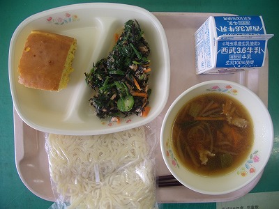 11月24日(金)の給食☆本日の献立☆ 広東めんスープ、ラーメン、ほうれん草とひじきのサラダ、オレンジパンケーキ 教務:手作りのオレンジパンケーキ、ふわふわしておいしかったです。ごちそうさまでした。 |