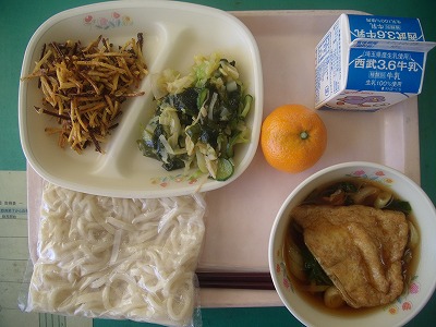 12月15日(金)の給食☆本日の献立☆ 地粉うどん、きつねうどんの汁、小魚入り松葉芋、和風サラダ、みかん 細い細い松葉芋、カリカリに揚がっていてとてもおいしかったです。きつねうどんも、大きなお揚げで食べ応えがありました。 |