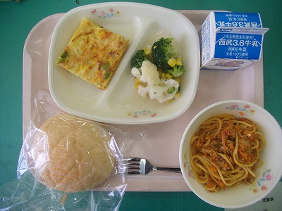 2月19日(火)の給食☆本日の献立☆ メロンパン、スパゲティミートソース、スパニッシュオムレツ、花野菜サラダ 今日は、「待ってました!」という声が聞こえそうなメニューです。甘いメロンパンにスパゲティミートソース。おいしくて、しかもお腹いっぱいになりそうです。 |