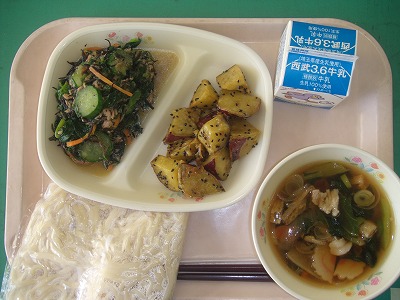 2月16日(金)の給食☆本日の献立☆ 地粉うどん、肉うどんの汁、大学芋、ほうれん草とひじきのサラダ 大学芋は、外はカリッと揚がり、中はふわっとしていて、甘いたれと胡麻もマッチしていて、とてもおいしかったです。肉うどんの汁も、肉と野菜のバランスがよく、味もよかったです。 |