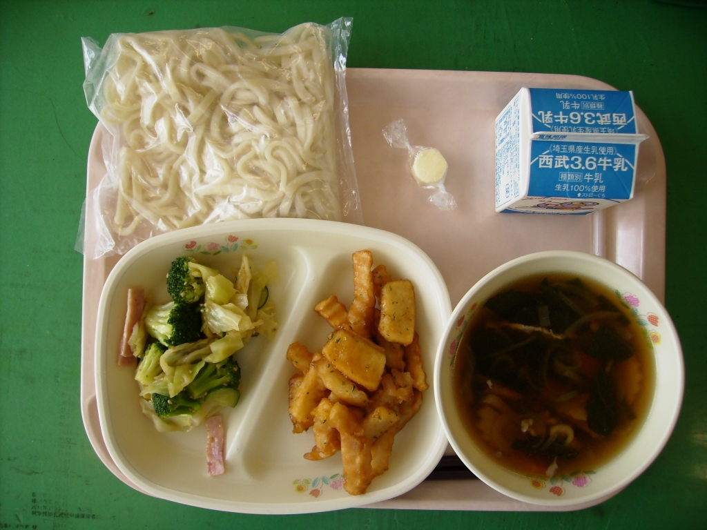 ☆今日の献立☆ 牛乳、肉うどん、イカとポテトの揚げ煮 ブロッコリーサラダ、チーズ今年から給食委員会が発足し、今日が初めての仕事でした。 イカとポテトの揚げ煮は、かりっと揚げたフライドポテトと かたくり粉をまぶしたイカを揚げて、甘辛のタレで和えました。 どのクラスもよく食べていました。 明日からは1年生の給食がスタートします。 |