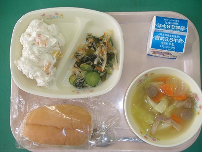 11月28日(火)の給食☆本日の献立☆ パン、フルーツクリーム、ポトフ、大根とじゃこのサラダ 今日は持久走大会でした。がんばった子どもたちに、大好きなフルーツクリームが出ました。パンにはさんで食べます。ポトフも冷えた体を芯から温めてくれました。 |