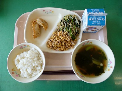 4月24日(月)の給食☆本日の献立☆ ご飯、ビビンバの具、揚げ餃子、わかめスープ キムチとともに、ビビンバも日本の食卓に浸透してきました。給食もバラエティに富んだメニューが出るようになっています。 |