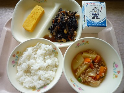 (メニュー) ひじき煮 じゃがいものそぼろ煮 あつやきたまご ご飯 牛乳 (食レポ) 肉じゃがもいいですが、そぼろ煮も美味しいです。 鶏肉が使われています。写真でもわかりますが、 とてもきれいな色に仕上がっています。 |