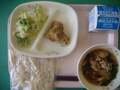 4月19日(木)の給食☆本日の献立☆ 地粉うどん、肉うどんの汁、ちくわの磯辺揚げ、グリーンサラダ 肉うどんは、その名のとおり、肉が結構入っていました。磯辺揚げも、カリッと揚がっていて食感も楽しめました。 |
