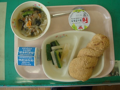 6月7日(火)の給食☆本日の献立☆ 黒糖きな粉揚げパン、スティック野菜、ワンタンスープ、フルーツヨーグルト ワンタンの量がちょうど良く、さらさらっと食べやすかったです。揚げパンは、子どもたちお待ちかねの主食でした! |