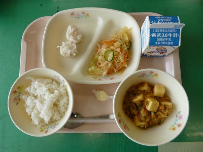 4月27日(木)の給食☆本日の献立☆ ご飯、麻婆豆腐、蒸しシュウマイ、中華サラダ、チーズ この日は、中華でした。麻婆豆腐でご飯もモリモリ食べられたことでしょう。 |