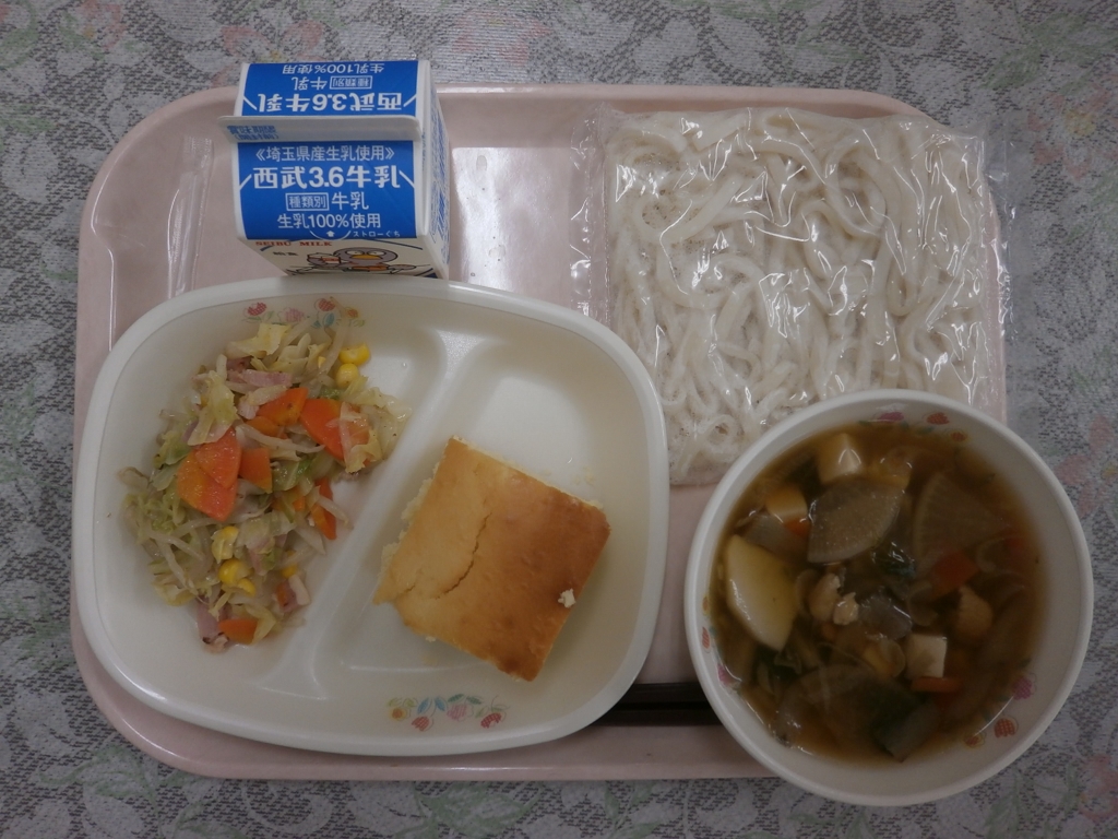 牛乳、けんちんうどん 野菜ソテー、リンゴパンケーキ