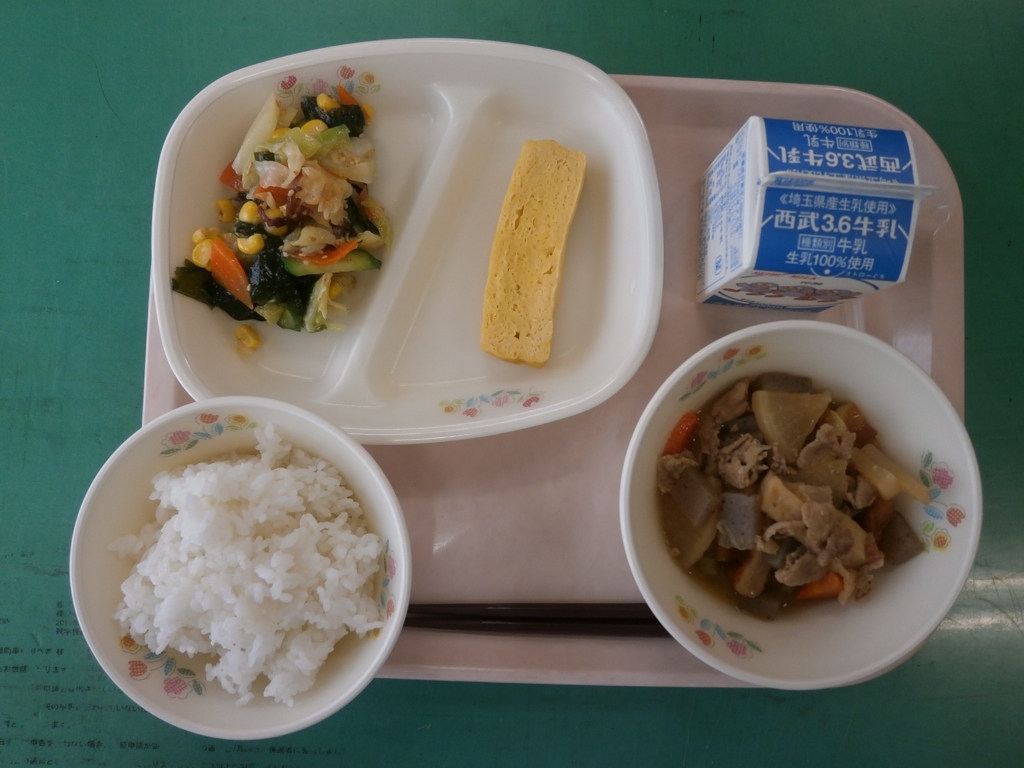 牛乳、ごはん、大根と豚肉の煮こみ 厚焼き卵、海草サラダ