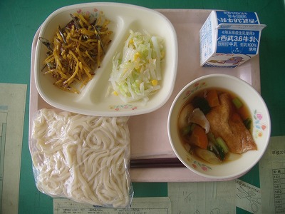 10月3日(水)の給食☆本日の献立☆ 地粉うどん、きつねうどんの汁、小魚入り松葉芋、三色サラダ 松の葉のように、細く切って揚げた、松葉芋。ぱりぱりとした食感でとてもおいしいです。大きなお揚げの入ったきつねうどんも、食べ応えがありました。 |