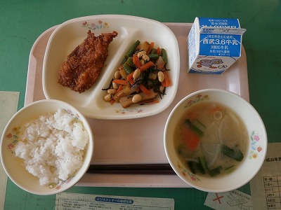 3月15日(金)の給食☆本日の献立☆ ご飯、カレー風味カツ、大豆の磯煮、野菜椀 カレー風味カツは、ご飯に載せてカツ丼にするそうです。卒業式に向けて、カツで力を付けてほしいですね! |