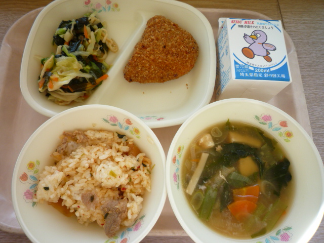 (献立) キムタクごはん カボチャ挽肉フライ まるごと玄米のポカポカ汁 和風サラダ 牛乳 (コメント) 冬至が近いことからカボチャを使ったフライが出ています。 今日のカボチャは皮ごと使われています。 ポカポカ汁は、とろみを少し感じます。 |