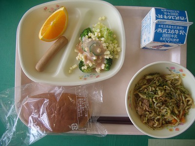 5月1日(火)の給食☆本日の献立☆ 黒パン、ソース焼きそば、焼ウインナー、チーズサラダ、くだもの パンに焼きそば、今日はとってもボリュームのある献立でした。お腹のすいている子には、とっても嬉しい給食だったことでしょう。1年生は、完食できたでしょうか? |