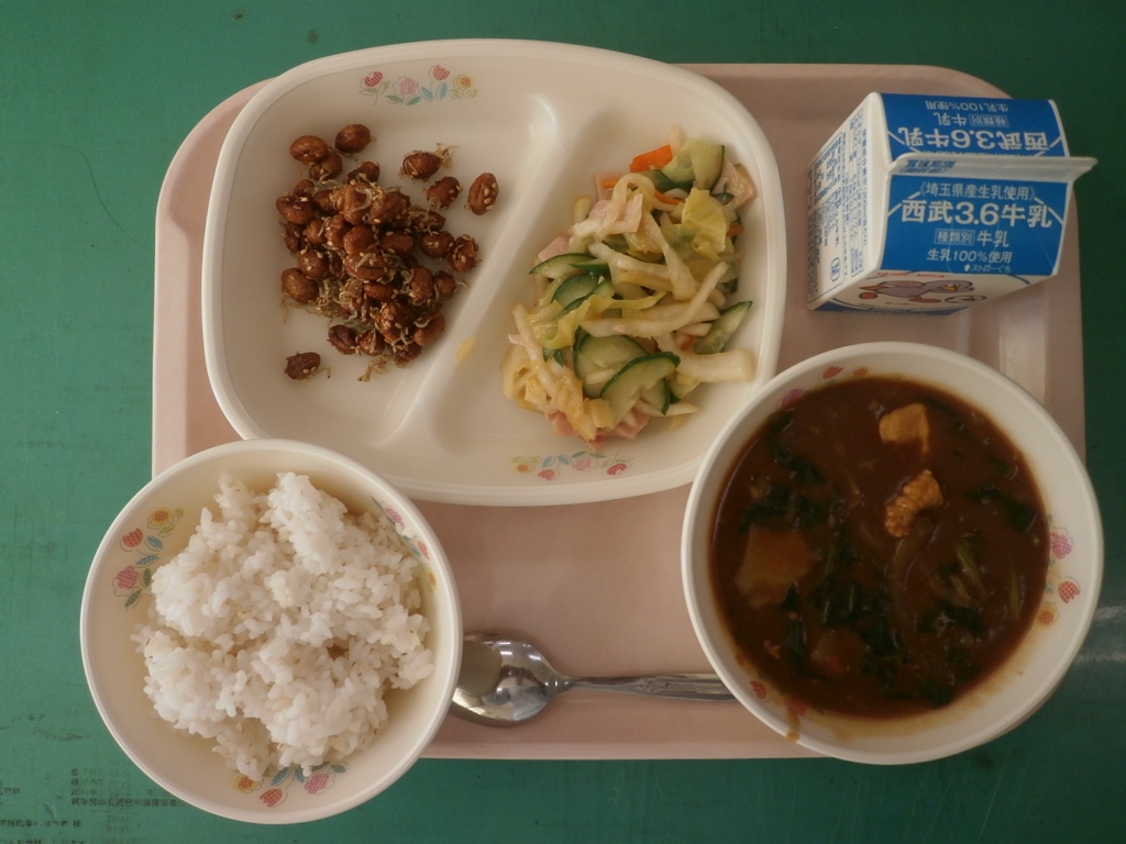 ☆今日の献立☆ 牛乳、むぎごはん、スピナッチカレー 大豆のしゃりしゃり揚げ ハムと大根のサラダ