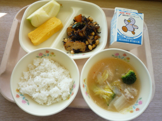 (献立) 大豆の磯煮 厚焼き玉子 キムチ鍋 牛乳 林檎 (コメント) キムチ鍋、白菜の他、ブロッコリーが存在感を出しています。 今朝は冷えました。キムチで温まりたいです。 |
