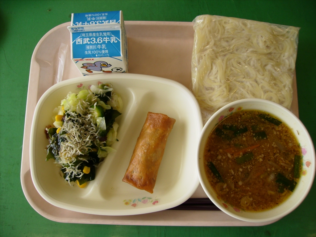 ☆今日の献立☆  牛乳、ごま味噌ラーメン 春巻き、海草サラダ 今日は、人気メニューのごま味噌ラーメンでした。 一手間かけて、胡麻をフライパンで炒って、すりごまにします。 胡麻の香りが食欲をそそります。 海草サラダも、じゃこを加えてカルシウムアップ!! 運動会の練習も始まりました。 栄養、休養をしっかりとって、疲れを残さないようにしましょう。 |