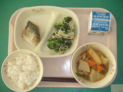 2月4日(月)の給食☆本日の献立☆ ご飯、サバの塩焼き、野菜のゴマネーズ和え、大根と豚肉の煮込み サバは皮がパリッと身はふっくらととてもおいしく焼けていました。煮込みも、生姜がピリッときいていて、ちょうどよい味付けでもありました。どちらもおかずにぴったりでした。 |