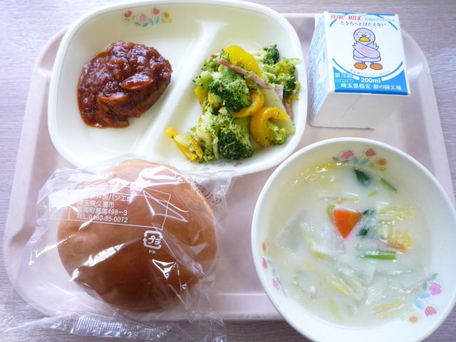 (献立) ハンバーガー ブロッコリーサラダ クラムチャウダー 牛乳 (コメント) 昨日、「ふかや園芸協会」様よりブロッコリーをいただき ました。今日のサラダに使われています。美味しくいただき ました。台風19号の影響で、榛沢地区でも被害を受けた農家が 多いと伺いました。野菜の値段が高くなっている中、大変あり がとうございます。 |