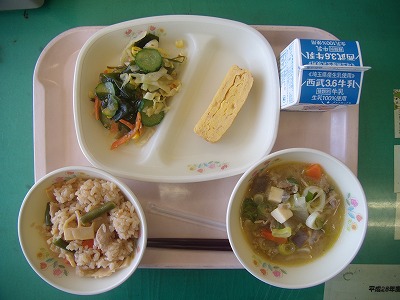 4月13日(木)の給食☆本日の献立☆ タケノコご飯、厚焼きたまご、海藻サラダ、豚汁 具がたくさんで、コクもある豚汁がとてもおいしかったです。 |