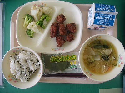 5月7日(月)の給食☆本日の献立☆ わかめご飯、カツオの香り揚げ、花野菜サラダ、みそ汁、柏餅 カツオの香り揚げが、カリッと揚がっていて、味も香りもしっかりついていて、ご飯のおかずにぴったりでした。とてもおいしかったです。 |