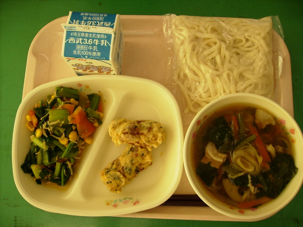 牛乳、きんぴらうどん ちくわの石垣揚げ 小松菜とじゃこの炒り煮