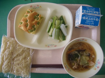 7月11日(水)の給食☆本日の献立☆ 醤油ラーメンスープ、枝豆チーズパンケーキ、スティック野菜 手作りの枝豆チーズパンケーキは、しっかり枝豆の食感も残っていて、ケーキ部分はふんわりしていて、とてもおいしかったです。お代わりしたかった子も多かったのではないでしょうか? |
