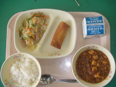 2月28日(水)の給食☆本日の献立☆ ご飯、マーボ豆腐、春巻き、深谷ネギのナムル ナムルのネギがしゃきしゃき、春巻きの皮がパリッ。おいしいのはもちろんですが、今日は食感でも楽しめました。 |
