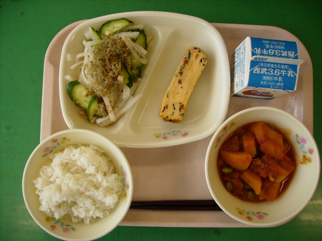 今日の献立  牛乳、ごはん、肉じゃがのトマト煮 厚焼き卵、じゃこと大根のサラダ 今日は、サラダが子どもたちに好評でした。 じゃこをごま油でかりっと炒め、冷まして、別に配食して クラスドレッシングと混ぜ合わせて食べました。 肉じゃがのトマト煮は、トマトの酸味と にんにくの香りが良かったです。