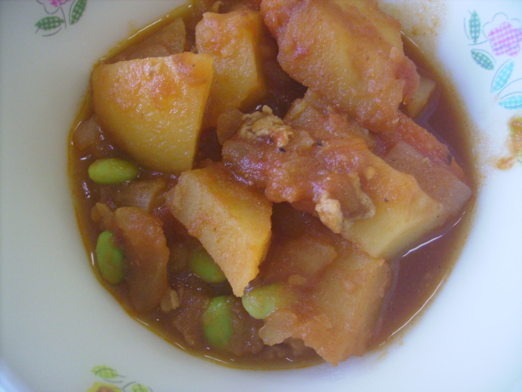 いつもの肉じゃがをアレンジして、トマト缶をたっぷり 入れて、イタリアンのメニューに変身。 |