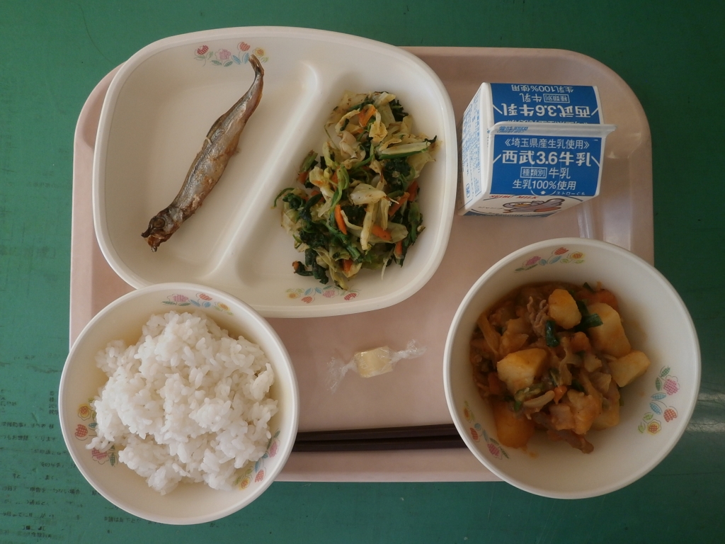 じゃがいもが柔らかく煮えていて、味がしみていて おいしかったと子どもたちに好評で残りゼロ。 水をあまり入れずに、蒸し煮にして、調味料は 3回くらいに分けて加えてじっくりと煮ました。 キムチの辛みも加わり、ご飯に合うメニューでした。 ししゃもは、骨ごと食べられて、カルシウムがしっかり取れる 食材です。育ち盛りに、カルシウムは重要な栄養素です。 しっかりとりたいですね。 |