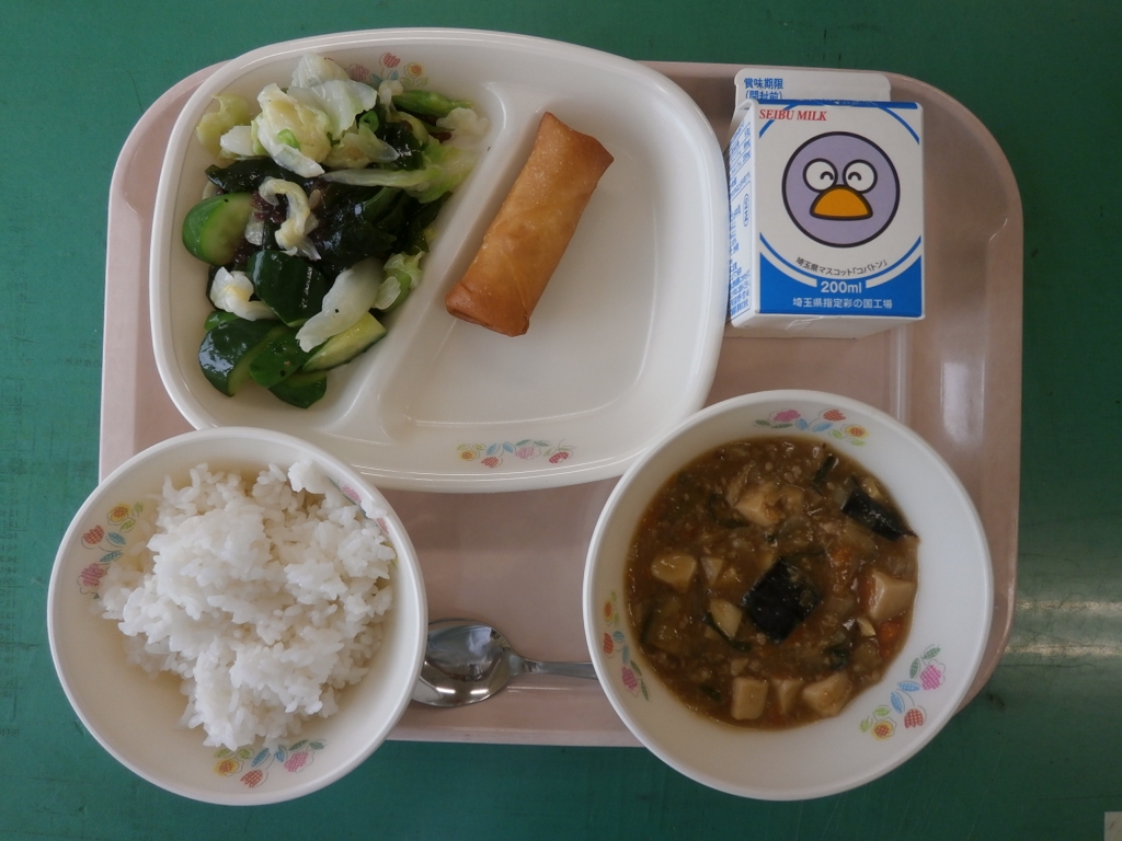 ☆今日の献立☆  牛乳、ごはん、マーボーなす豆腐 春巻き、海草サラダ マーボーなす豆腐は、旬の食材「なす」をたっぷり使いました。 なすは素揚げして、最後に加え仕上げました。 ちょっとピリ辛で、ご飯にマッチしていたようで、 今日はご飯の残滓0「ゼロ」でした。 海草サラダには、2年生が育てたきゅうりが入りました。 こちらも1人分くらい残っただけでした。今日もよく食べました。 |