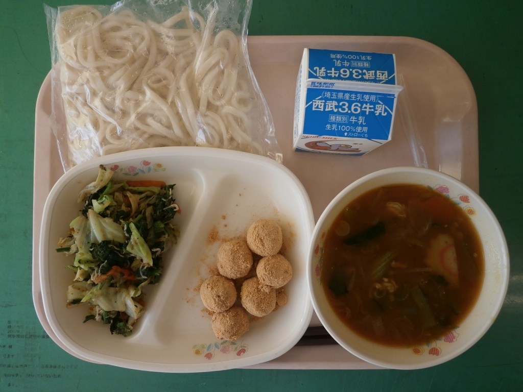 ☆今日の献立☆ 牛乳、カレーうどん、磯の香和え 白玉団子きなこあえ