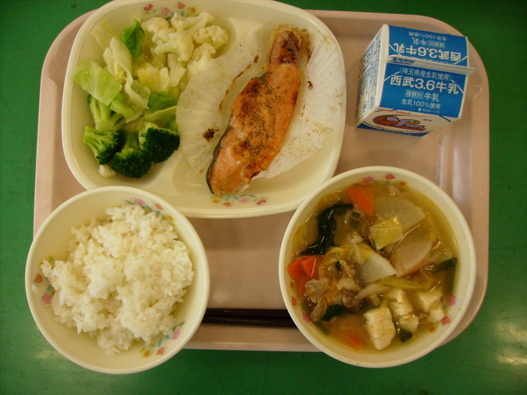 今日の献立  牛乳、ごはん、鮭のめんたいマヨネーズ焼き 豚キムチスープ、花野菜のサラダ 今日は、豚キムチスープが児童に好評でした。 野菜がたっぷりと入って、キムチのピリ辛が食欲をそそります。 キムチスープは、野菜も入り塩分も補給できるので 暑い夏には、冷たものばかり取らずに こういったメニューも上手に取りいれたいですね。 |