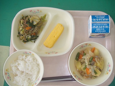 6月15日(金)の給食☆本日の献立☆ ご飯、厚焼き卵、煮浸し、ジャガイモのそぼろ煮 梅雨寒。温かいジャガイモのそぼろ煮が嬉しかったです。煮浸しも、鰹節たっぷりで、懐かしい味でした。 |