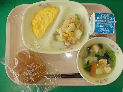 こどもパン、オムレツ、カラフルポテト、豆腐と野菜のコンソメスープ カラフルポテト、名前のとおり、緑、黄色、赤…カラフルな野菜がたっぷり入ったメニューです。 |