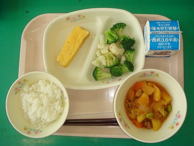 ご飯、肉じゃがのトマト煮、厚焼きたまご、花野菜のサラダ 肉じゃがのトマト煮。トマトの酸味がジャガイモの甘さを引き出していたように感じました。さっぱりしていておいしかったです。 |