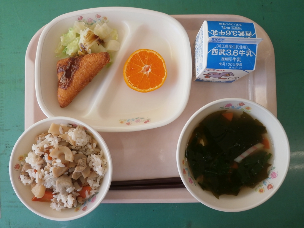 今日は「かてめし」という秩父地方の郷土料理を提供しました。 酢飯に、給食室で煮た具を混ぜました。 「かてる」とは混ぜると言うことをいうそうです。 具には、高野豆腐、油揚げ、にんじん、ごぼう、たけのこ かんぴょう、干ししいたけ、ごまが入りました。 はんぺんチーズフライも、子どもたちに好評でした。 みかんも甘くておいしかったです。 明日は、深谷の郷土料理「ねぎぬた」がでます。 お楽しみに♪