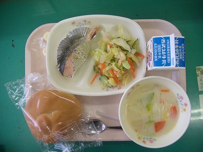 3月21日(火)の給食☆本日の献立☆ さきたまロールパン、鮭のムニエル、セサミサラダ、クラムチャウダー、ミニチーズ 今日は、真冬のような寒さになりました。クラムチャウダーで温まりました。 |