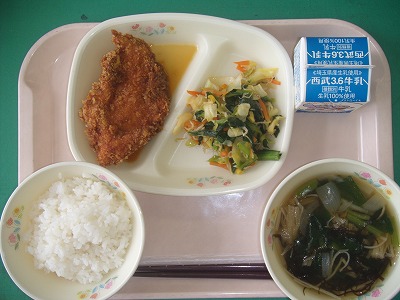 7月10日(月)の給食☆本日の献立☆ ご飯、とりカツ、小松菜とじゃこの炒り煮、もずくのスープ 暑さを吹き飛ばすために、今日はカツ丼でした。栄養をつけて、暑さを乗り切って欲しいです。 |