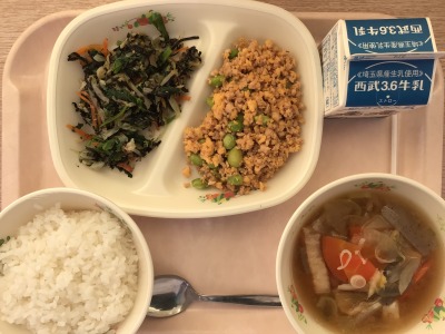 三色そぼろご飯・磯の香あえ・キム豚汁