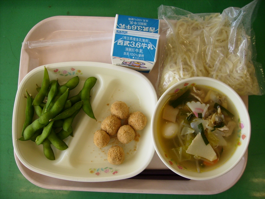 今日の献立  牛乳、タンメン、白玉団子のきな粉和え えだまめ 今日は枝豆が児童には人気でした。 茹でた枝豆を冷蔵庫でしっかり冷やして提供しました。 白玉団子も、相変わらす人気です。 タンメンには野菜がたっぷり入って、塩味で おいしかったです。 |