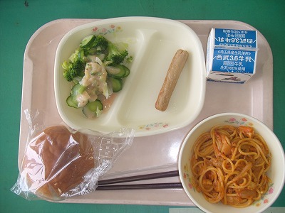 6月5日(火)の給食☆本日の献立☆ ハチミツパン、トマトクリーム・ジェノバ風パスタ、焼ウインナー、グリーンサラダ 今日は、パンもあって、パスタもあって、ボリュームたっぷりのメニューでした。お腹ぺこぺこの子どもたちにとっては、嬉しい給食だったでしょうね。パスタも、とってもおいしかったです。 |