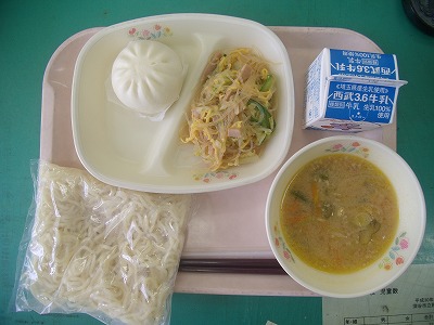 11月7日(水)の給食 ☆本日の献立☆ ラーメン、胡麻味噌ラーメンの汁、彩の国肉まん、中華サラダ 今日は中華セット?でした。胡麻風味のラーメンの汁は、コクがあってとてもおいしかったです。中華サラダも、ごま油の風味でこちらもおいしくいただきました。 |