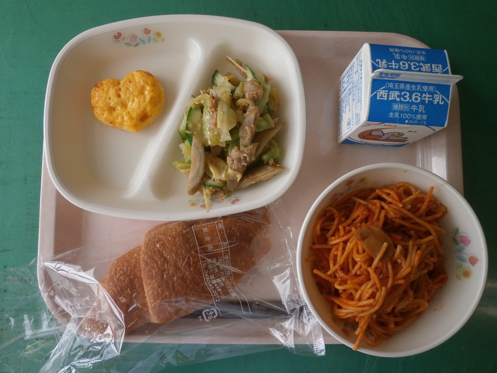 ☆今日の献立☆ 牛乳、クロワッサン、スパゲティナポリタン ハートオムレツ、ヘルシーサラダ