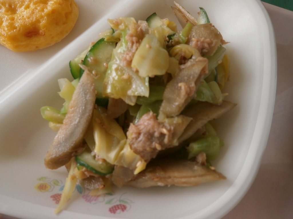 ごぼうの入ったヘルシーサラダも人気でした。 ごぼうを茹でて、温かいうちにしょうゆをふって 冷ましました。しょうゆがごぼうにしみて食べやすくなります。 ツナも子どもたちの好きな食材のひとつです。 今日は残りゼロでした。よく食べました♪